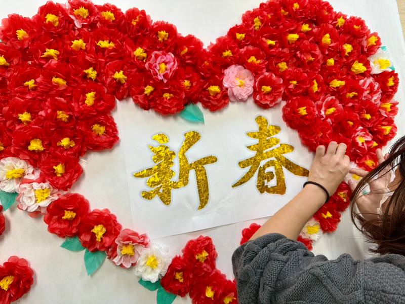 飾りの中央には、「新春」の金色の文字を千切り絵で表現しました。