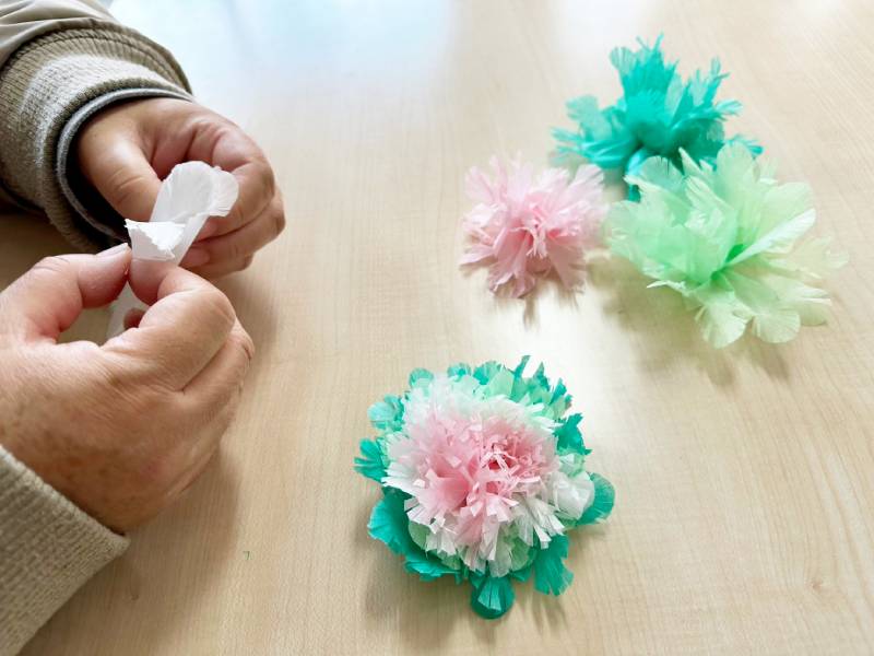 ふんわりとした質感のお花紙は扱いやすい一方で、形を整えたり、花らしさを出したりするのが意外と難しく、皆さん最初は少し苦戦されている様子でした。